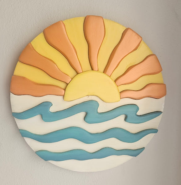 A joyful celebration of sun and sea, Coastal Radiance is a hand-cut and painted circular artwork that radiates warmth and simplicity. Soft pastel hues of peach, yellow, and blue evoke a serene sunrise over gentle ocean waves. Each piece is carefully crafted and layered to give a sense of movement and depth, capturing the essence of a calm, early morning at the shore. Its playful curves and clean design make it a bright, uplifting piece that brings coastal charm to any space.