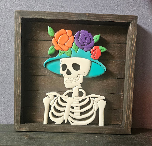 Dahlia is a whimsical skeleton brought to life with charm and elegance. Adorned in a vibrant teal hat crowned with colorful flowers, she celebrates both beauty and timelessness. Her playful yet sophisticated design makes her a striking piece of art that blends gothic undertones with joyful, floral flair. Perfect for adding character to your home décor, Dahlia is a reminder that life—and art—should always be celebrated with color and style.