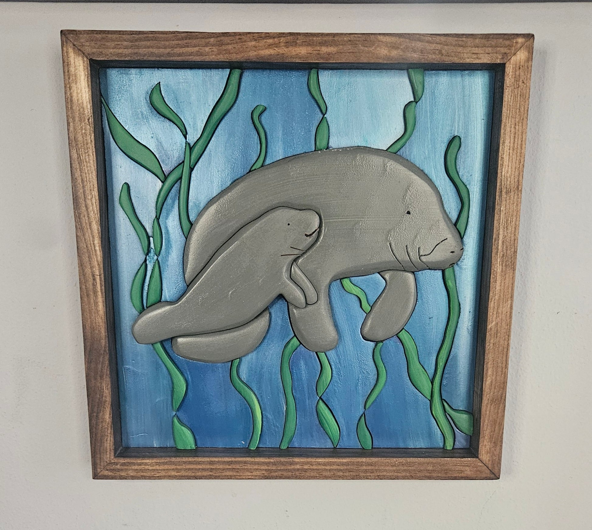 Gentle Waters is a handcarved and hand-painted tribute to the tender bond between a mother and baby manatee, inspired by the serene sightings of these gentle giants in Weeki Wachee, Florida. The artwork features smooth, flowing forms of the manatees as they glide gracefully through a vibrant underwater world of swaying seagrass and soft blue currents. The lovingly crafted wood frame enhances the organic warmth of the piece, evoking the peaceful rhythm of nature and the quiet magic of Florida’s spring-fed rivers. A heartfelt celebration of motherhood and marine life.