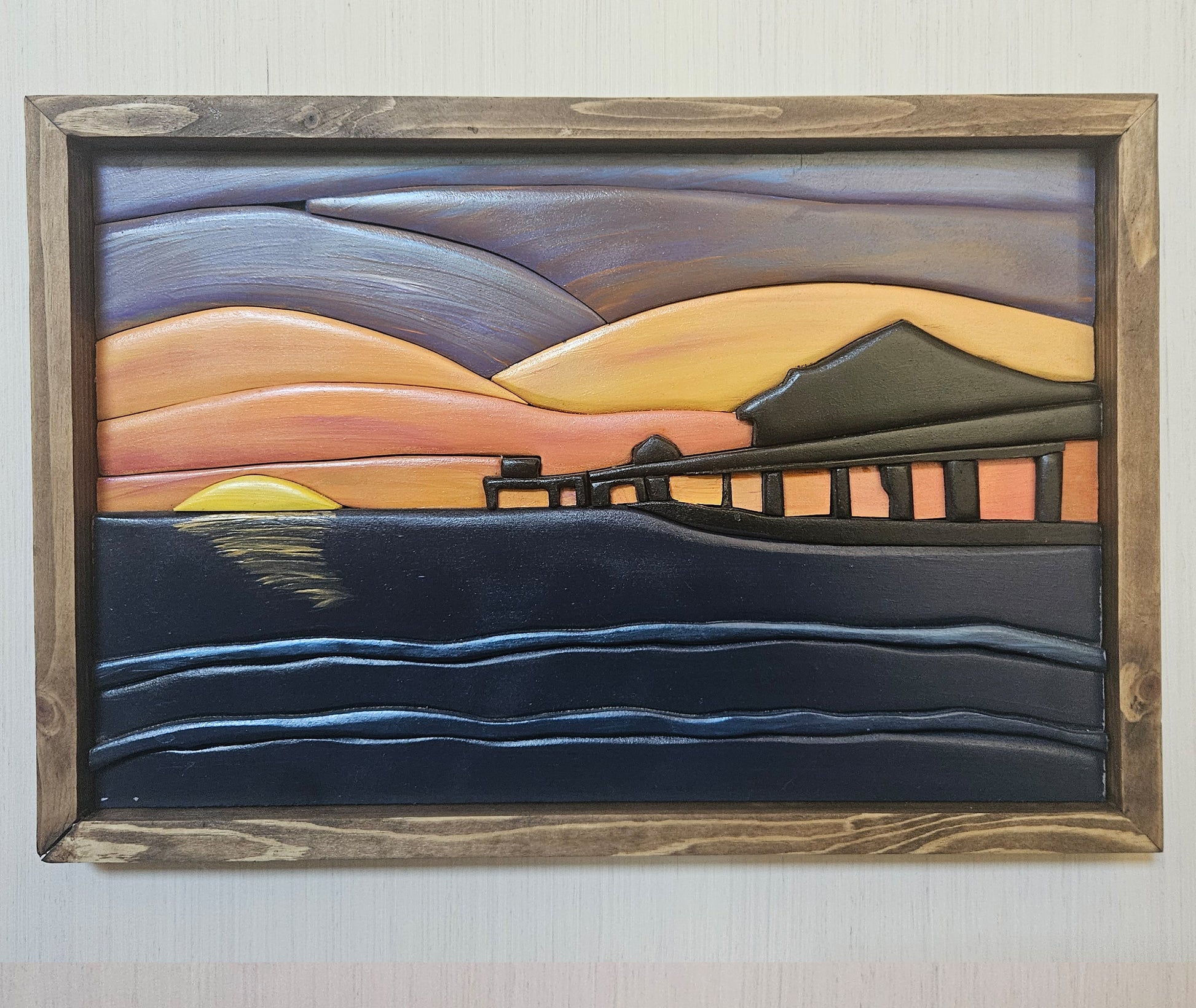 This hand-cut and painted piece captures the radiant beauty of a sunset at Pier 60 on Clearwater Beach. The layered woodwork brings depth to the dusky sky, where glowing oranges, purples, and golds melt together behind the silhouetted pier and gentle waves. Each detail—from the glowing sun dipping below the horizon to the soft shimmer of light on the water—has been carefully crafted and painted by hand. Framed in a rustic, handmade pine frame, Golden Hour at Pier 60 is a warm, vivid tribute to Florida’s Gulf Coast at its most magical.