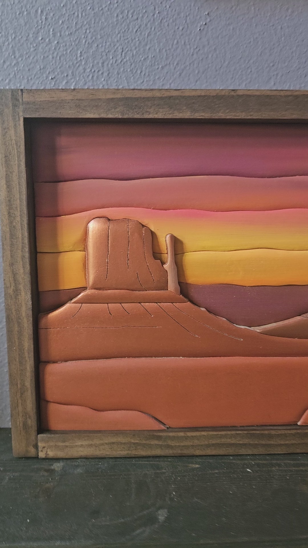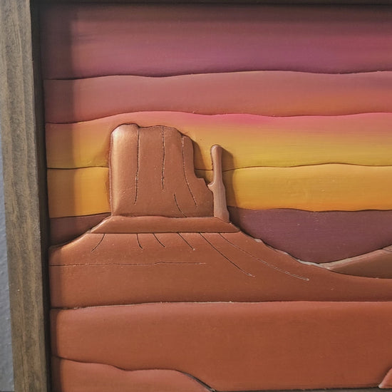 This artwork captures the breathtaking beauty of Monument Valley, where towering buttes rise from the desert floor beneath a radiant sunset sky. The textured 3D design brings the natural wonder to life, while the rustic wooden frame enhances its earthy, timeless feel. A perfect piece for anyone who loves the spirit of the American Southwest and the endless horizons of desert skies.