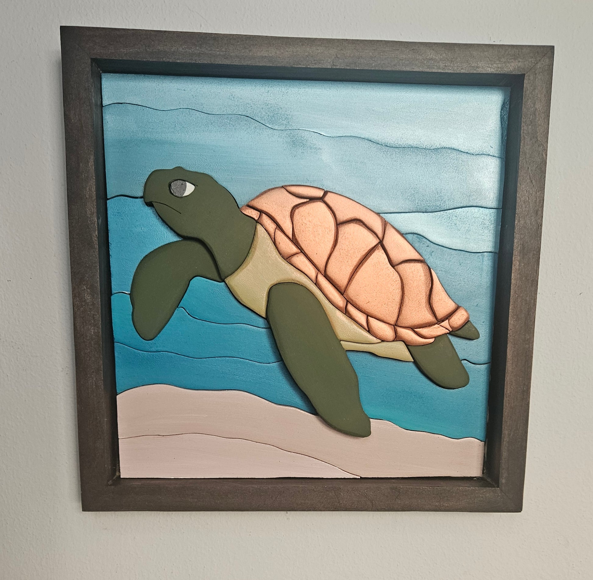A gentle sea turtle glides gracefully through the warm coastal waters. Hand-cut from layered wood and painted with care, it's olive-green flippers and copper-toned shell reflect the serene beauty of ocean life. Each piece is crafted to evoke movement, as if it is swimming just beyond the frame. Set in a handmade pine frame, this artwork captures the essence of the sea in both texture and tone—a timeless reminder of nature’s quiet wonders.