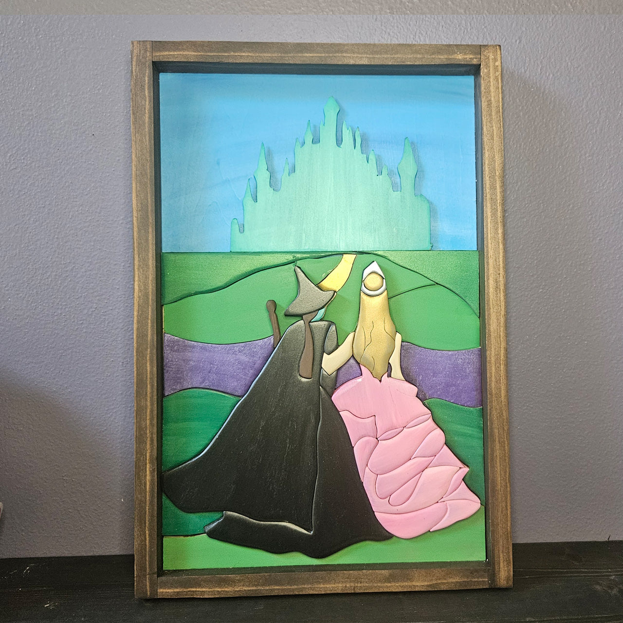 Inspired by the iconic moment from Wicked, One Short Day captures the magic of friendship and adventure as Elphaba and Glinda stand hand in hand, gazing at the Emerald City. Crafted from layered wood and richly hand-painted, this piece brings a storybook moment to life with flowing lines, bold silhouettes, and vibrant color.