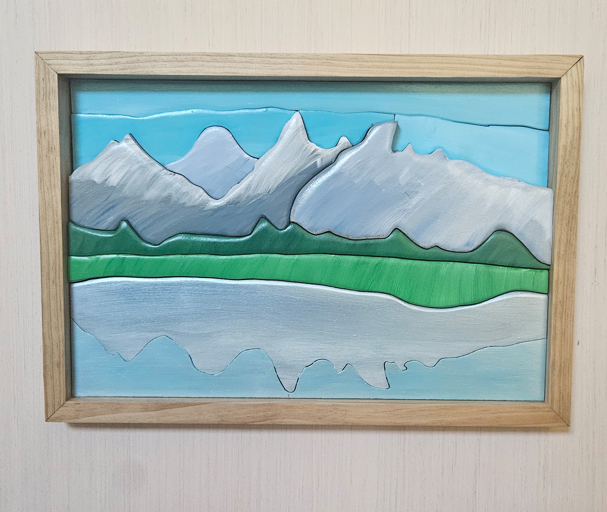 This hand-cut and painted wood artwork captures the majestic Grand Teton Mountains rising boldly against a crisp blue sky, mirrored perfectly in the calm waters below. With cool silvers and snowy whites shaping the iconic peaks, and rich greens painting the forested base, the reflection adds a serene balance that invites quiet contemplation. Each element is individually carved and painted, giving the scene texture and life, while the handcrafted pine frame adds a natural, rustic finish. Still Waters of the Tetons is a tribute to the raw grandeur and tranquil beauty of one of America’s most iconic landscapes.