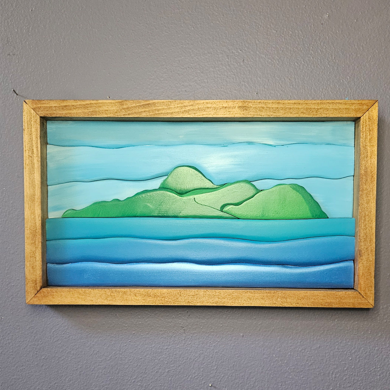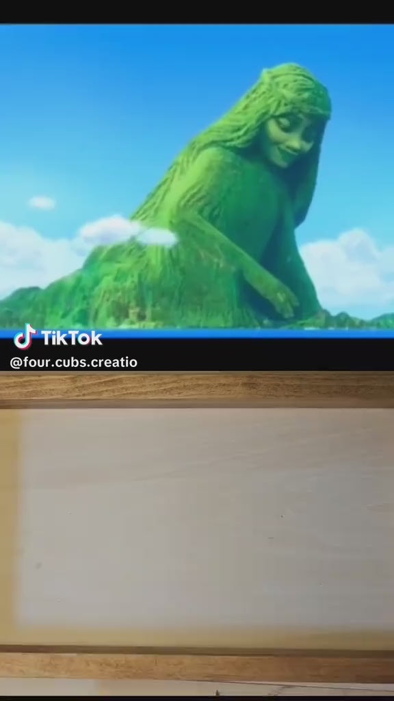 Inspired by the heart of Te Fiti from Moana this captures the peaceful strength and nurturing spirit of the goddess-turned-island. This layered wooden artwork features soft rolling hills emerging from tranquil waters, with gentle gradients of green and blue evoking a sense of harmony, balance, and renewal.