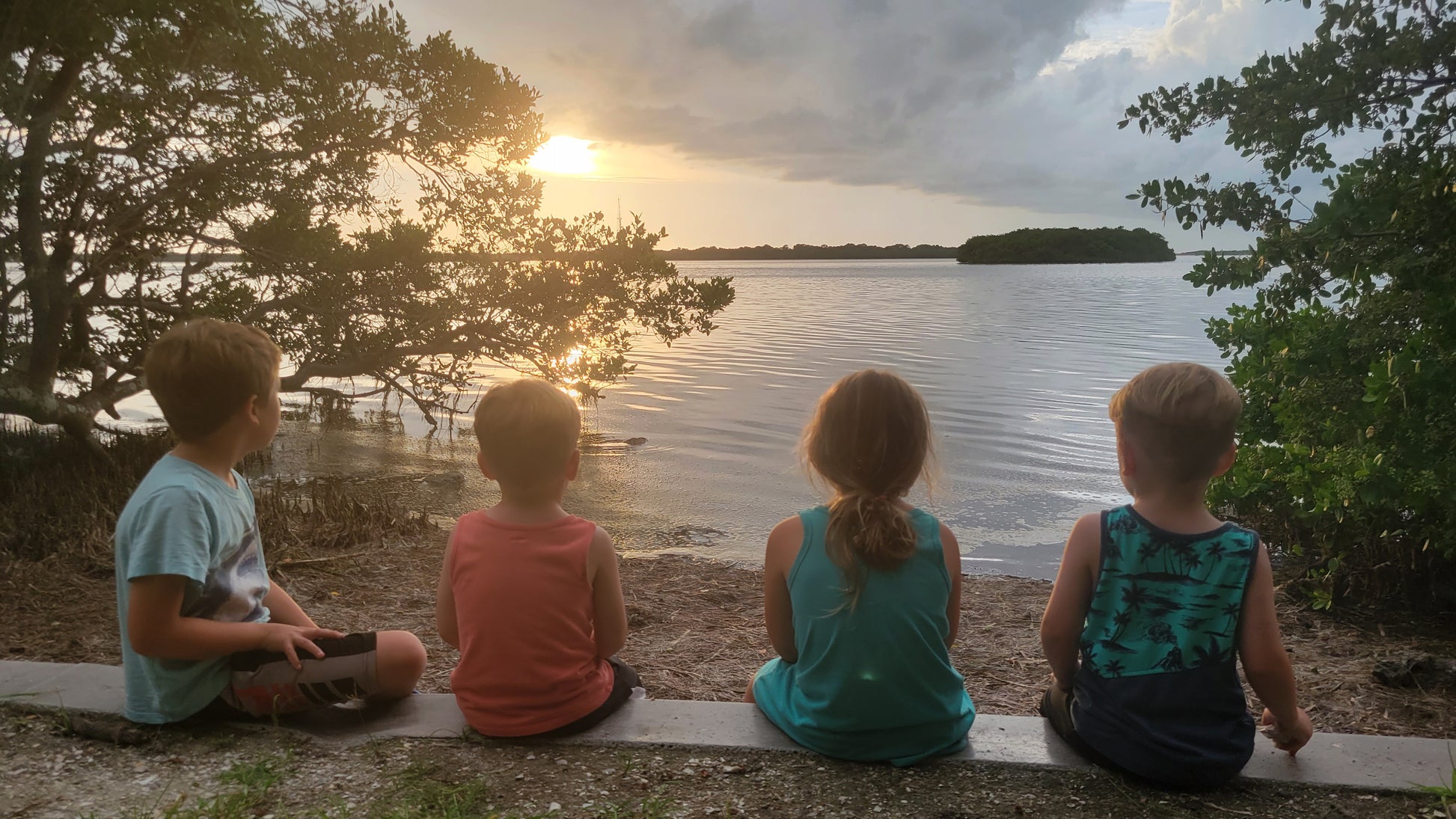 This photo is a family favorite—capturing a beautiful sunset and a quiet moment with our four kids. I recreated it in a handmade, layered artwork crafted from wood, filled with color and heart.